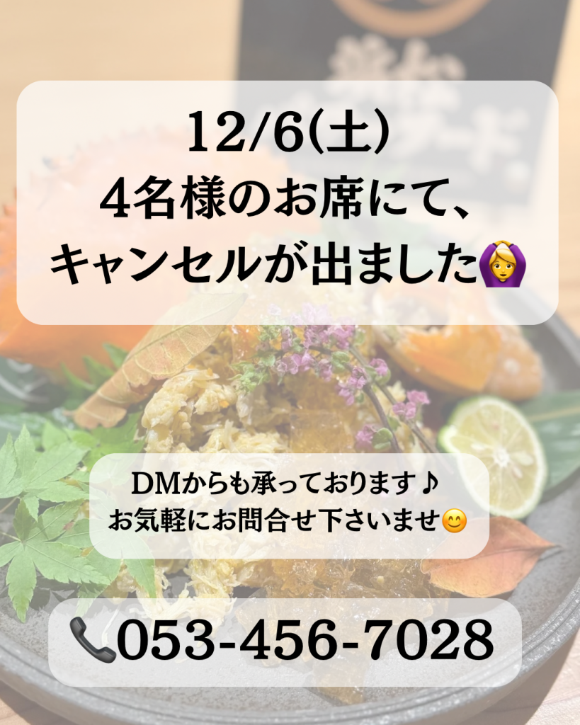 12/6(土)、4名様席にてお席のキャンセルが出ました‼︎