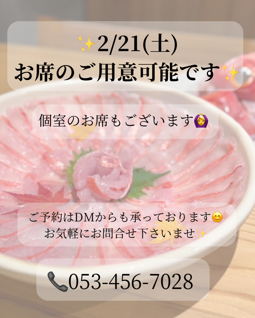 2/21(土) お席のご用意可能です😊 個室のお席もございます🙆♀️ お気軽にお問合せ下さいませ🙇♀️ 皆さま...