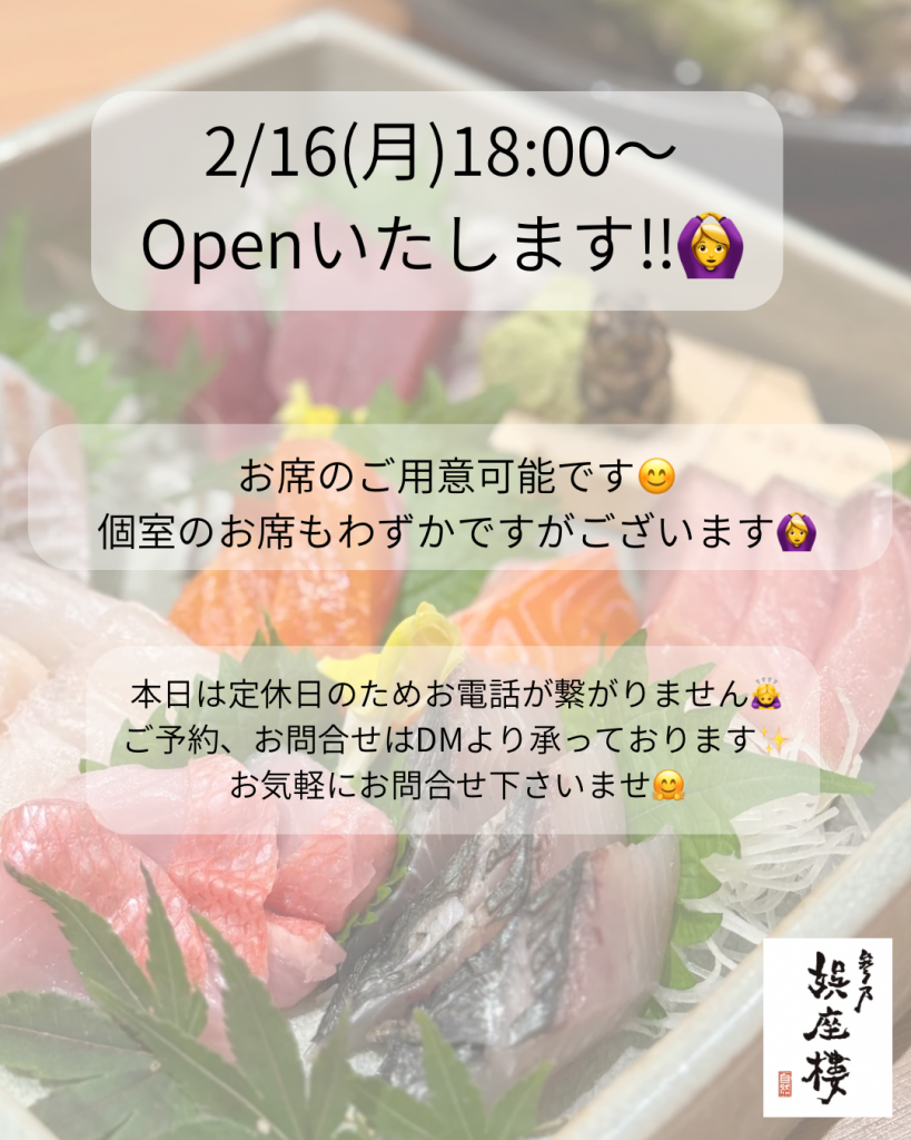 2/16(月)、お席のご用意可能です🙆♀️! わずかですが、個室のお席もございます! 本日はお電話が繋がりません...