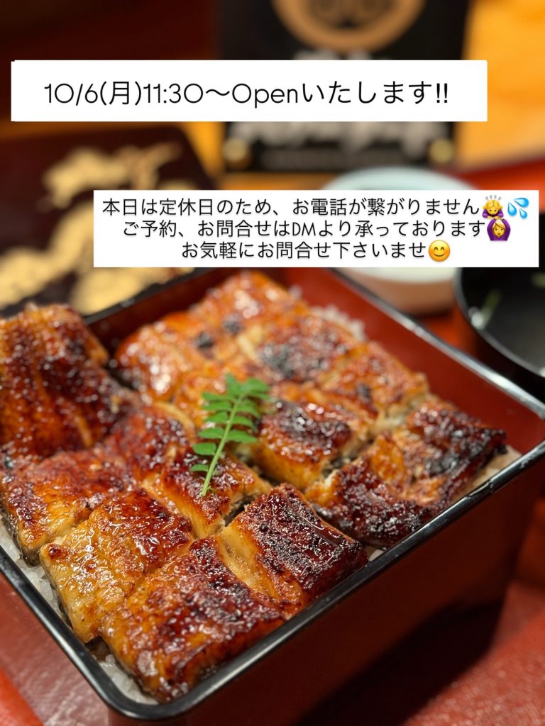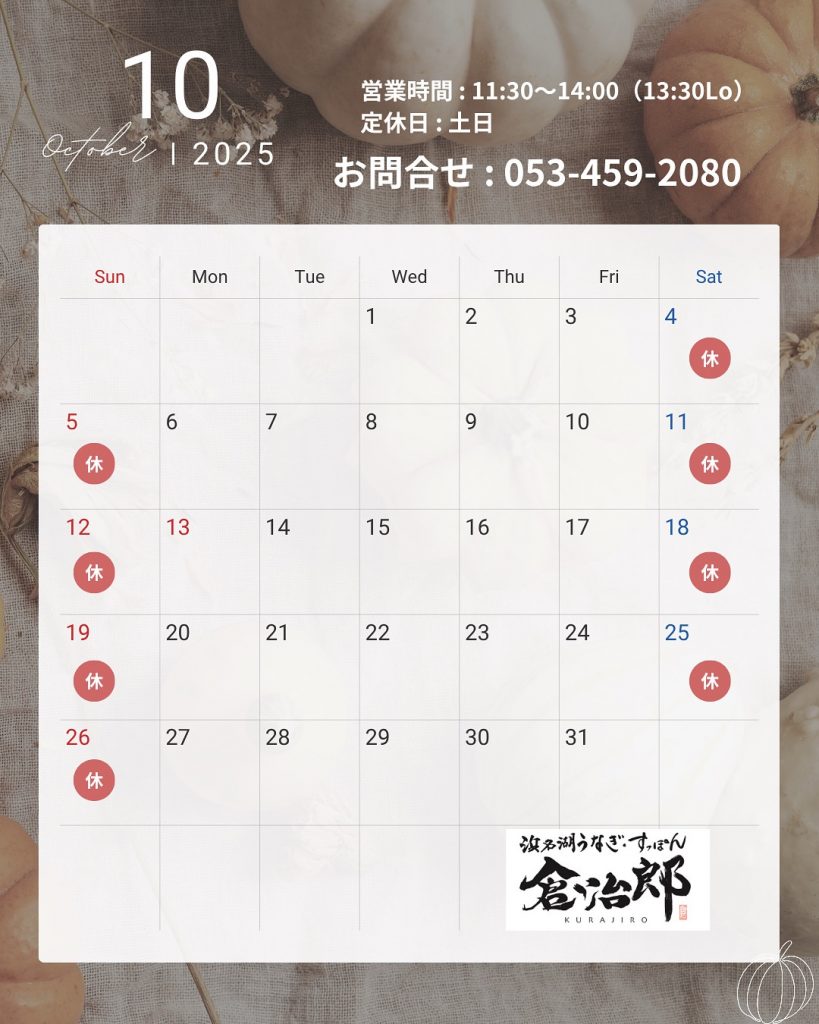 【浜名湖うなぎ・すっぽんの倉治郎】 10月営業日のお知らせです🙌 10/13(月)は祝日㊗️ですが、営業しております‼︎ ...